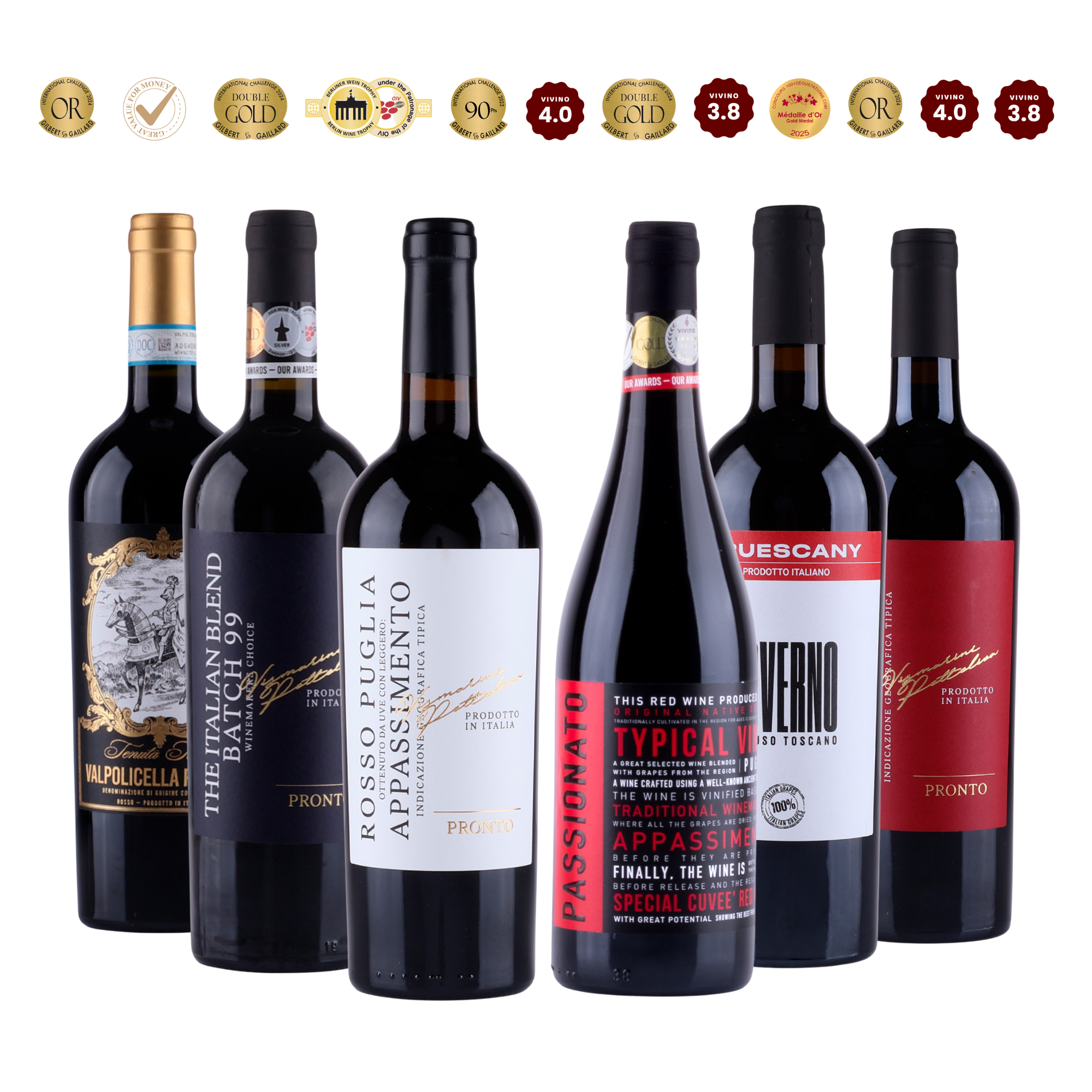 Pronto Rosso Puglia Appassimento on täyteläinen ja monivivahteinen viini Apuliasta, joka valmistetaan osittain kuivatusta rypäleestä. Viini on syvänpunainen ja maussa on kypsiä punaisia hedelmiä, kuten kirsikoita ja luumuja, sekä mausteiden ja vaniljan vivahteita. Sen rakenne on pehmeä, ja tanniinit antavat miellyttävän suuntuntuman.
