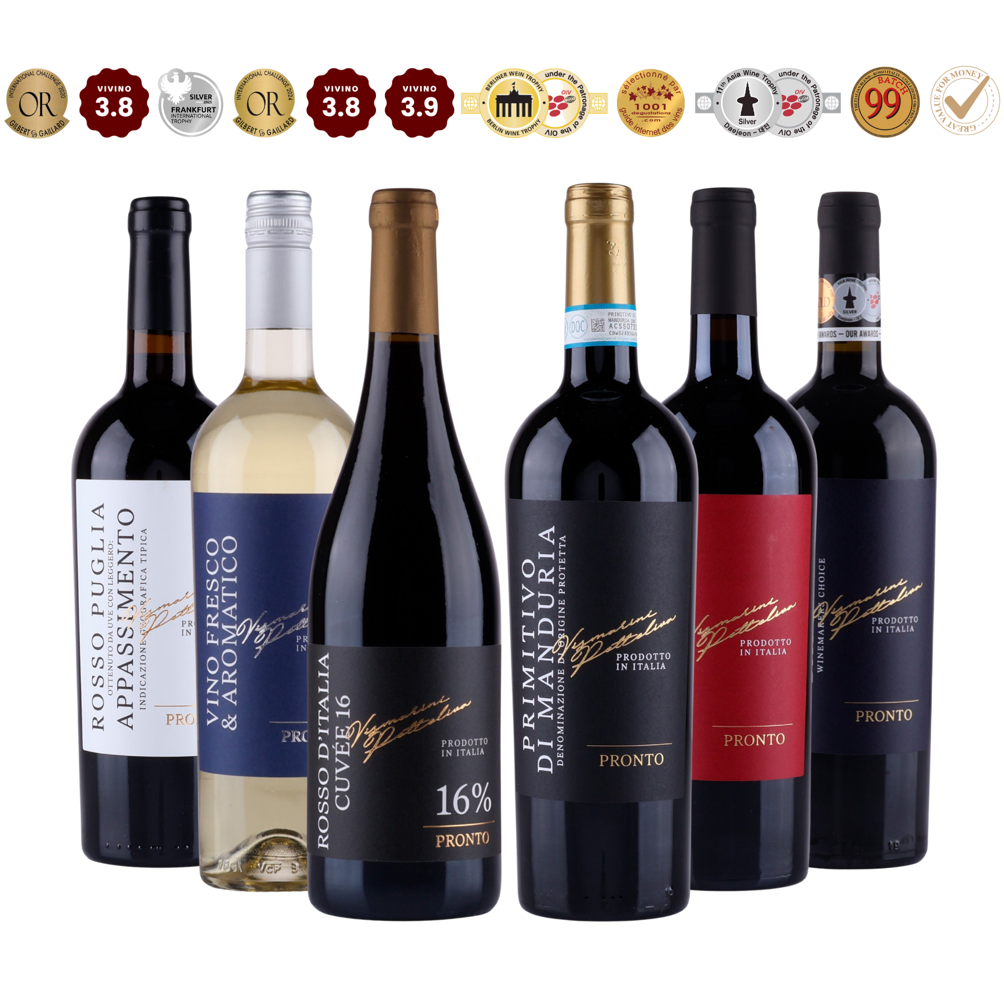 Pronto-kokoelma tarjoaa kuusi eksklusiivista italialaista viiniä, jotka yhdistävät punaisia ja valkoisia vaihtoehtoja. Täydellinen viinin ystäville, jotka haluavat tutkia uusia makuelämyksiä keskittyen laatuun ja tasapainoon.