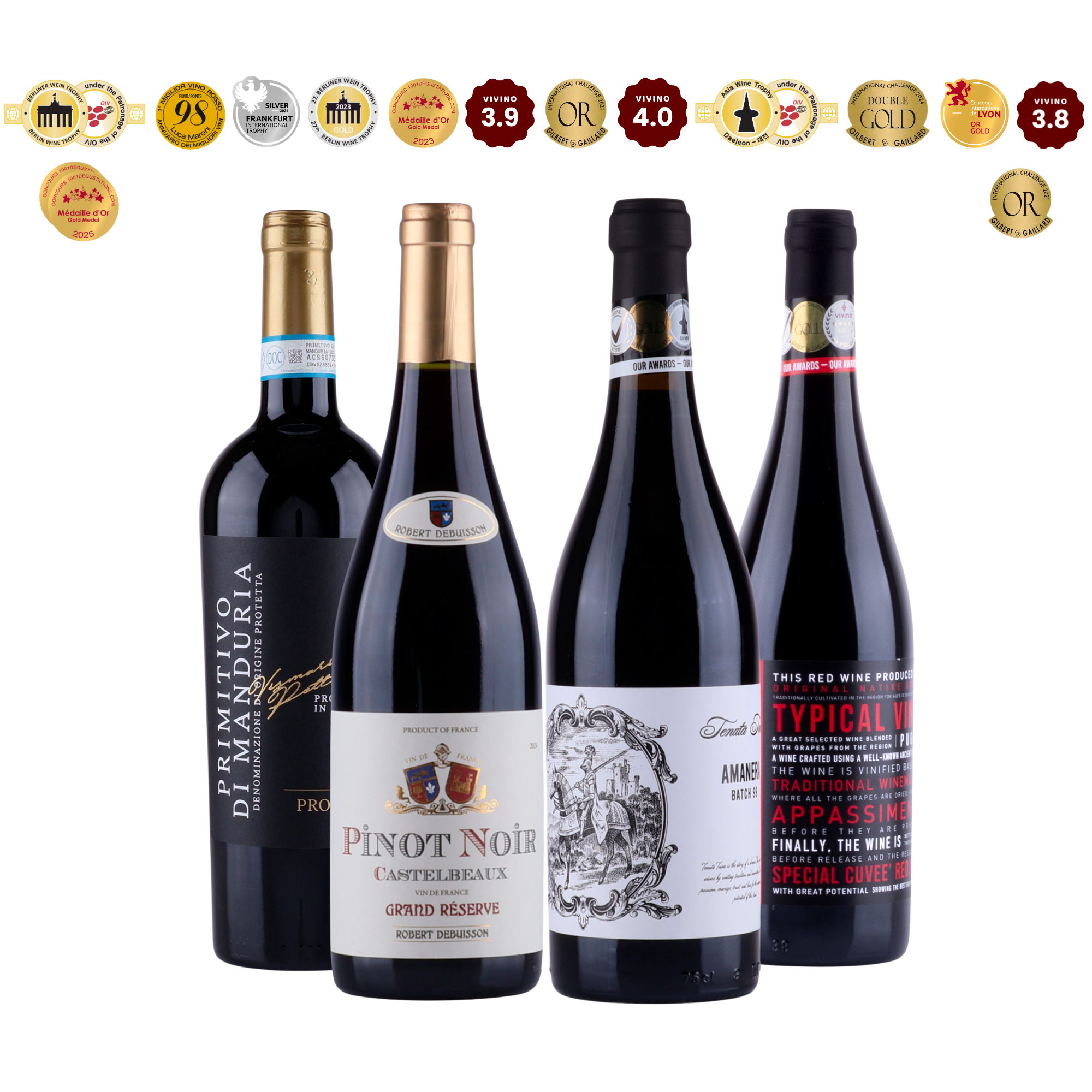 Vinhusets Fire Favoritter antaa sinulle mahdollisuuden maistaa 4 parasta viiniämme – ilman, että sinun tarvitsee ostaa koko viinipakettia. Täydellinen sinulle, joka haluat tutkia uusia makuelämyksiä ja löytää suosikkisi. Riippumatta siitä, oletko uusi viinin ystävä tai kokenut viininharrastaja, tämä maisteluviinipaketti on lippusi unohtumattomalle viinimatkalle. Tilaa nyt ja saat 4 upeaa viiniä suoraan ovelle!